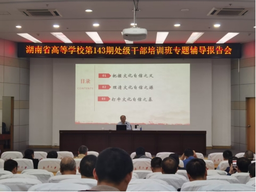 上午的课程由湖南师范大学教授、博士生导师周小毛教授以“中华民族伟大复兴的精神力量——学习习近平总书记关于文化自信的论述”为主题讲授,从把握文化自信之义、理清文化自信之源和打牢文化自信之基三个方面为培训班学员上了一堂生动的专题讲座。周小毛教授指出文化自信是一种价值认同,以及更基础、更深层、更持久的力量。打牢文化自信,要坚持和发展马克思主义、推动中国传统文化的创造性转化和创新性发展以及加强世界文化间的交流互鉴。