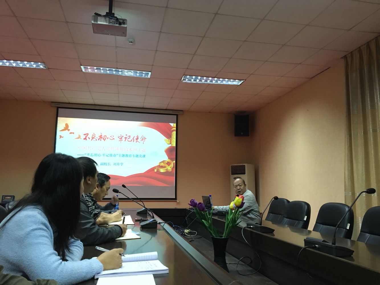刘升学首先从“不忘初心、牢记使命”主题教育的根本任务、总要求和目标出发,从中国共产党从哪里来,中国共产党要到哪里去、为了谁、依靠谁、我是谁以及“不忘初心、牢记使命”主题教育总要求的四个维度等方面,全面阐述了共产党人党性锤炼的永恒主题。他结合我校实际,着重探讨了共产党人全心全意为人民服务的根本宗旨。他表示,我校全力解决了学生宿舍和教学楼安装空调的工程,斥资解决了猪肉涨价食堂用肉的问题,为教师提供幸福午餐,并全力推进棚户区改造工程。刘升学总结道:“我校以实际行动真正落实了‘守初心要诚、找差距要准、担使命要勇、抓落实要狠’的总要求。”