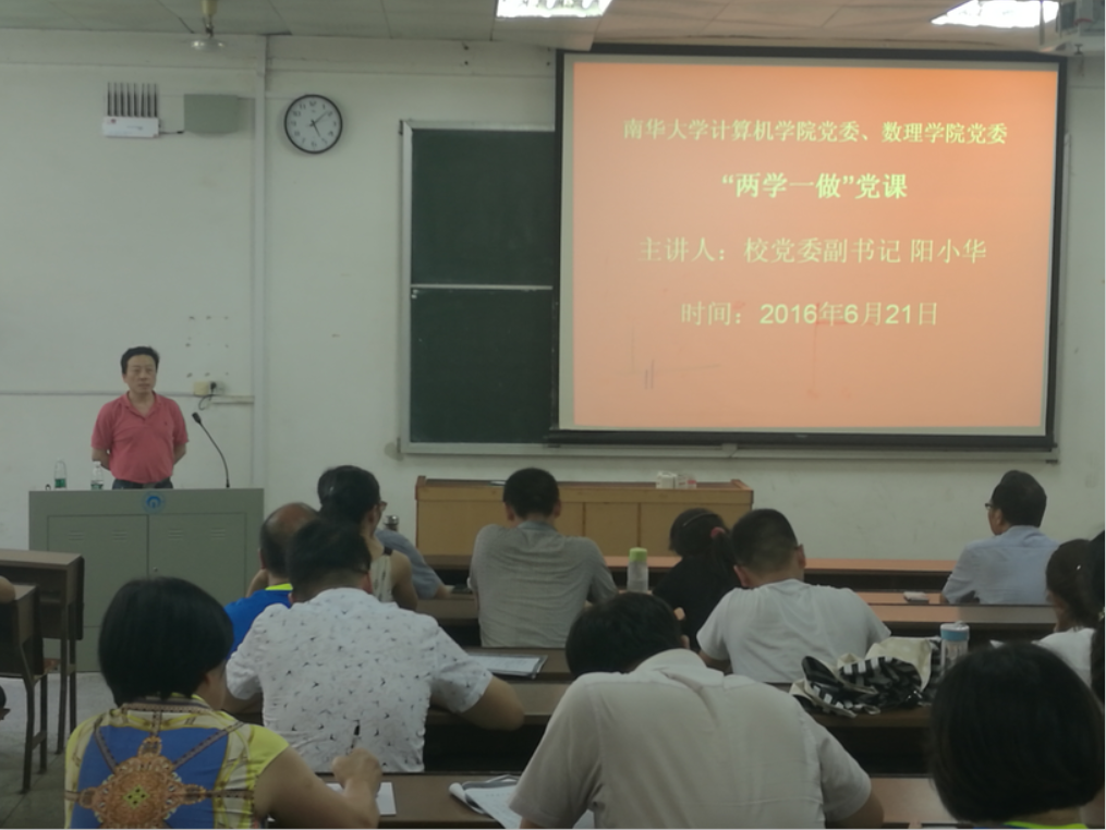 2016年6月21日下午,校党委副书记阳小华在8教310室为计算机科学与技术学院与数理学院的全体师生党员上了一堂生动的“两学一做”学习教育第一专题“讲政治、有纪律”党课。